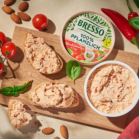 Erlebe mit BRESSO 100% PFLANZLICH Kirschtomaten & Chili den beliebten BRESSO-Geschmack jetzt rein pflanzlich. Der vegane Aufstrich auf Mandelbasis vereint die luftig-lockere Textur und die beliebte Komposition aus süßlichen Kirschtomaten und feiner Schärfe von original Chili aus Espelette in Südfrankreich.