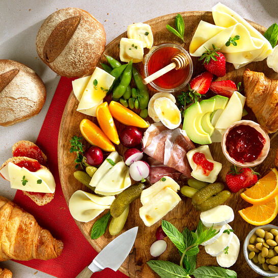 Géramont Le Snack und Géramont Cremig-Würzig in mundgerechte Stücke schneiden und auf dem Board verteilen. Géramont cremig-zarte Scheiben sahnig-mild auf dem Board platzieren.
