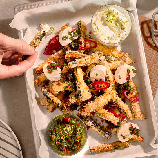 Für die Zucchini Fries den Backofen auf 200°C Umluft (180°C Ober-/Unterhitze) vorheizen. Zucchini waschen, trocken tupfen, Strunk entfernen und in ca. 1 cm dünne Stifte schneiden.