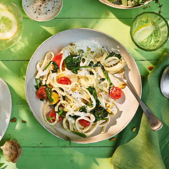 Die bissfest gegarten, kurz abgetropften Bandnudeln mit 2 EL Olivenöl, der Ziegenkäse Sauce und dem Spinat-Tomaten Gemisch aus der Pfanne vermengen. Die Pasta auf Tellern anrichten und abschließend mit gerösteten Pinienkernen garnieren.